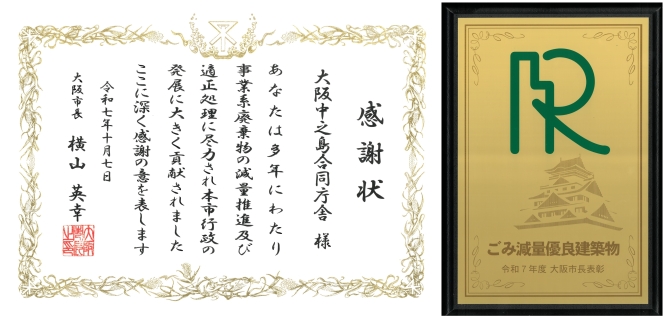 本年10月7日、大阪市長から、「事業系廃棄物の減量推進及び適正処理」について、大阪中之島合同庁舎に対する感謝状と記念品の贈呈がありました。