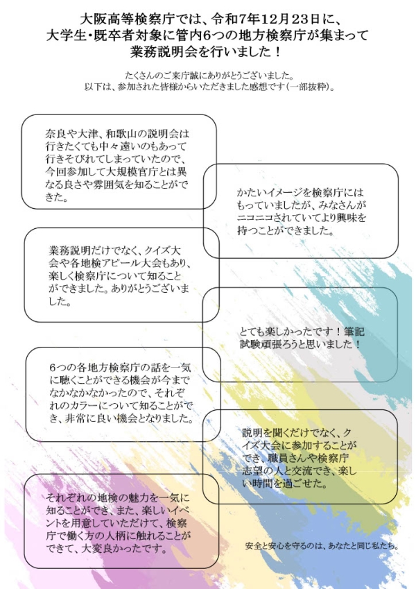 大阪高等検察庁では、12月23日に大学生・既卒者を対象に業務説明会を実施いたしました。