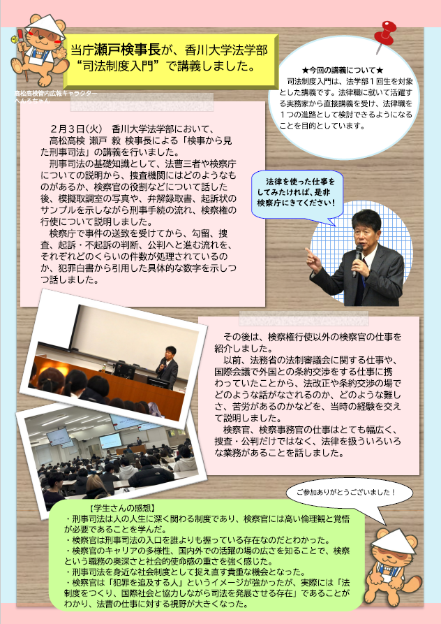 令和8年2月3日(火)、当庁瀬戸検事長が、香川大学法学部『司法制度入門』において、“検事から見た刑事司法”と題して講義を行いました。 講義の詳細については、こちらをご覧ください。