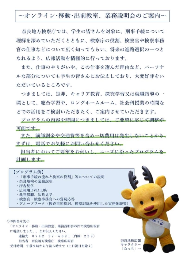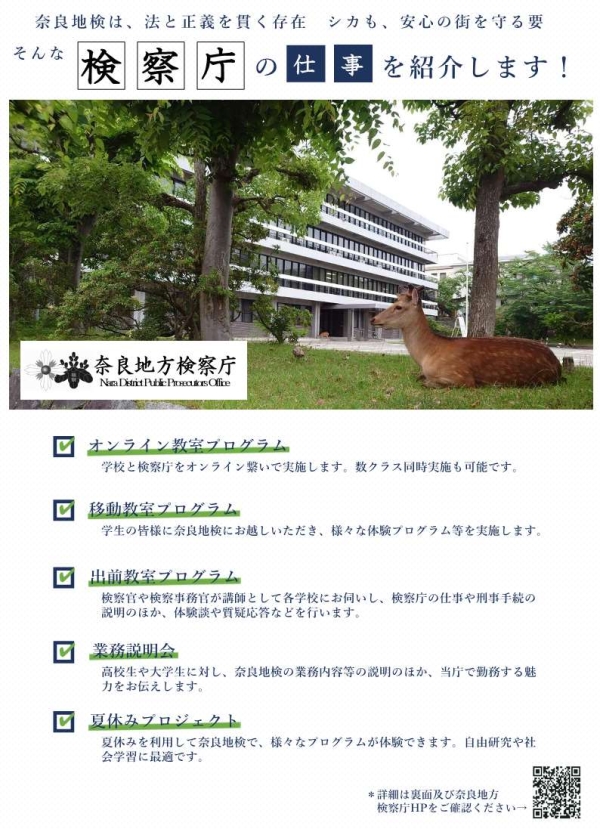奈良地方検察庁では、検察庁の業務等について国民の皆様に知っていただけるよう、検察官や検察事務官が学校などにお伺いして業務説明などを行う「出前教室プログラム」や、検察庁に来ていただいて、業務説明などを行う「移動教室プログラム」を実施しています。